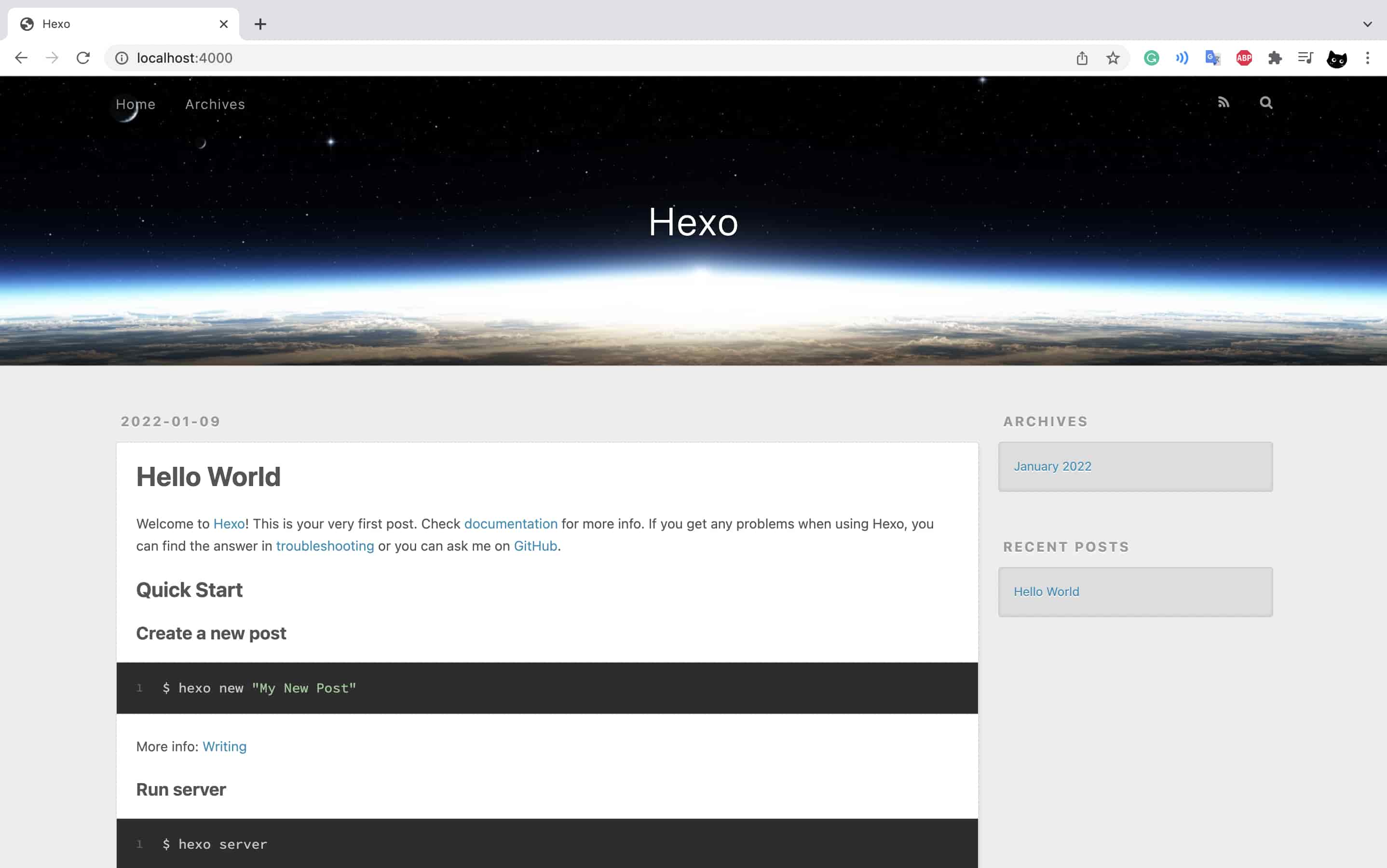 Now, our hexo blog is live on our computer! Open a web browser and enter the following address: