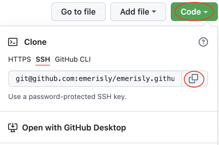 In your github repo, click the green button “Code” with a little drop down arrow. Select SSH and copy the entire address that looks something like “git@github.com:yourUserName/yourUserName.github.io.git”.